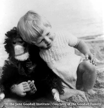 Jane Goodall was born in London on April 3, 1934, and developed an early fascination with animals after receiving a stuffed toy chimpanzee from her father–a cherished companion she kept throughout her life. As a child, she immersed herself in Tarzan stories about a boy raised by apes who falls in love with a woman named Jane.