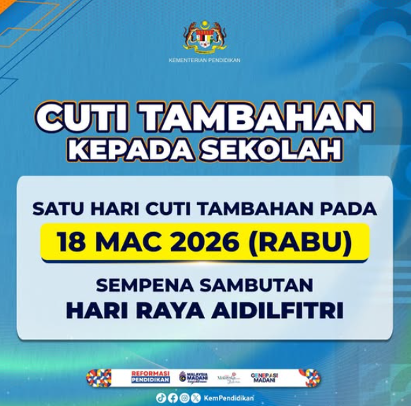 The Ministry of Education announced that March 18, 2026, would be an additional holiday for all schools in Malaysia. This would allow students and teachers to enjoy a holiday a little earlier before the upcoming celebrations of Hari Raya Aidilfitri.