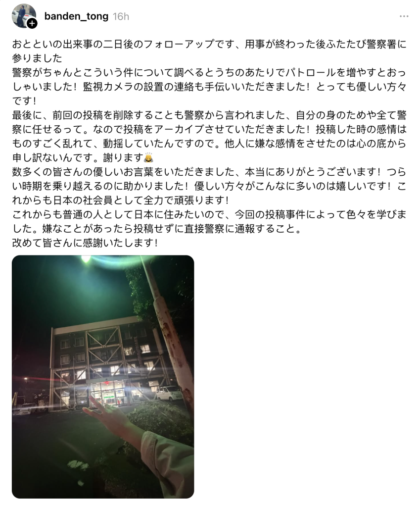 Two days after his viral post about receiving a hate-filled message telling him to “leave Japan”, Malaysian English teacher Banden Tong has shared an update, saying he has returned to the police station and will now leave the matter entirely in the authorities’ hands.