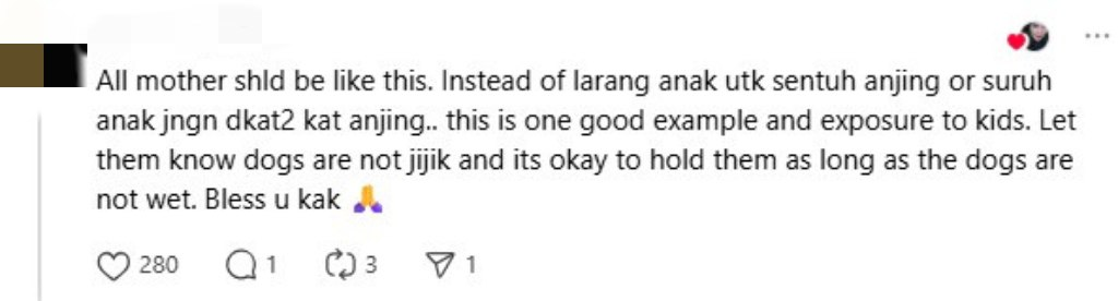 “All mothers should be like this. Instead of forbidding children from touching dogs or telling them to stay away, this is a good example and valuable exposure for kids. Let them learn that dogs aren’t “dirty,” and it’s perfectly okay to hold them as long as they’re not wet. Bless you, kak.”