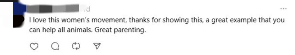“I love this women’s movement — thank you for sharing this. It’s a great example that shows you can help all animals. Truly great parenting.”