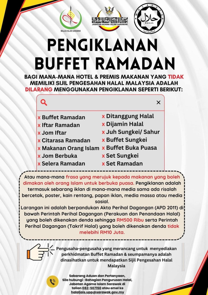 The Sarawak advisory also highlighted penalties of up to RM500,000 under the Trade Descriptions Act 2011, with an additional warning that fines under the Trade Descriptions (Definition of Halal) regulations could reach as high as RM10 million.