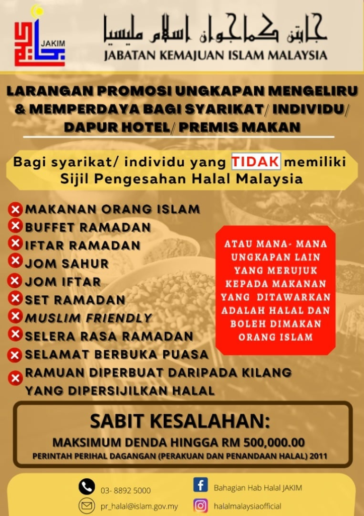 Department of Islamic Development Malaysia (JAKIM) has likewise issued nationwide reminders, with an infographic circulated on social media in January 2025 listing the same prohibited terms and maximum penalties, reinforcing the seriousness of halal-related advertising compliance.