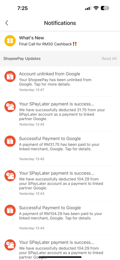 The scammer hastily initiated three SPayLater transactions to Google after the user unsuspectingly linked his ShopeePay to ‘Google’.