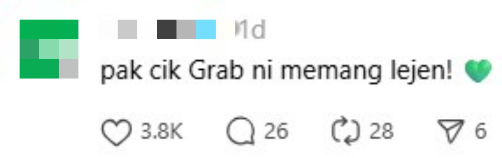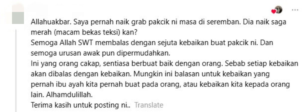 “I once rode with this uncle on Grab in Seremban — he drove a red Saga, right? May Allah SWT reward him and ease your affairs. This reminds us to always be kind, as goodness is always repaid in its own way. Alhamdulillah, and thank you for this post.”