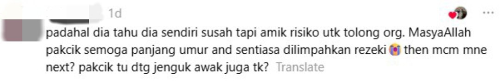“He knows he’s struggling himself, but he still took the risk to help others. MasyaAllah, uncle, may you live a long life and always be blessed with sustenance. So what happened next? Did the uncle come to check on you again?”