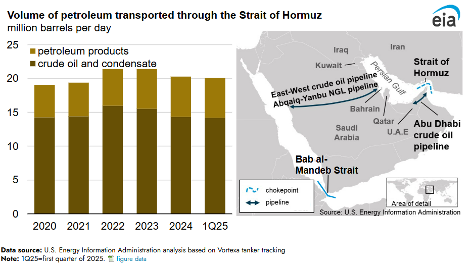 • On average, 20 million barrels of oil per day (roughly 20-25% of global consumption) flows through it,  and very few alternative options exist to move oil out of the strait if it is closed.